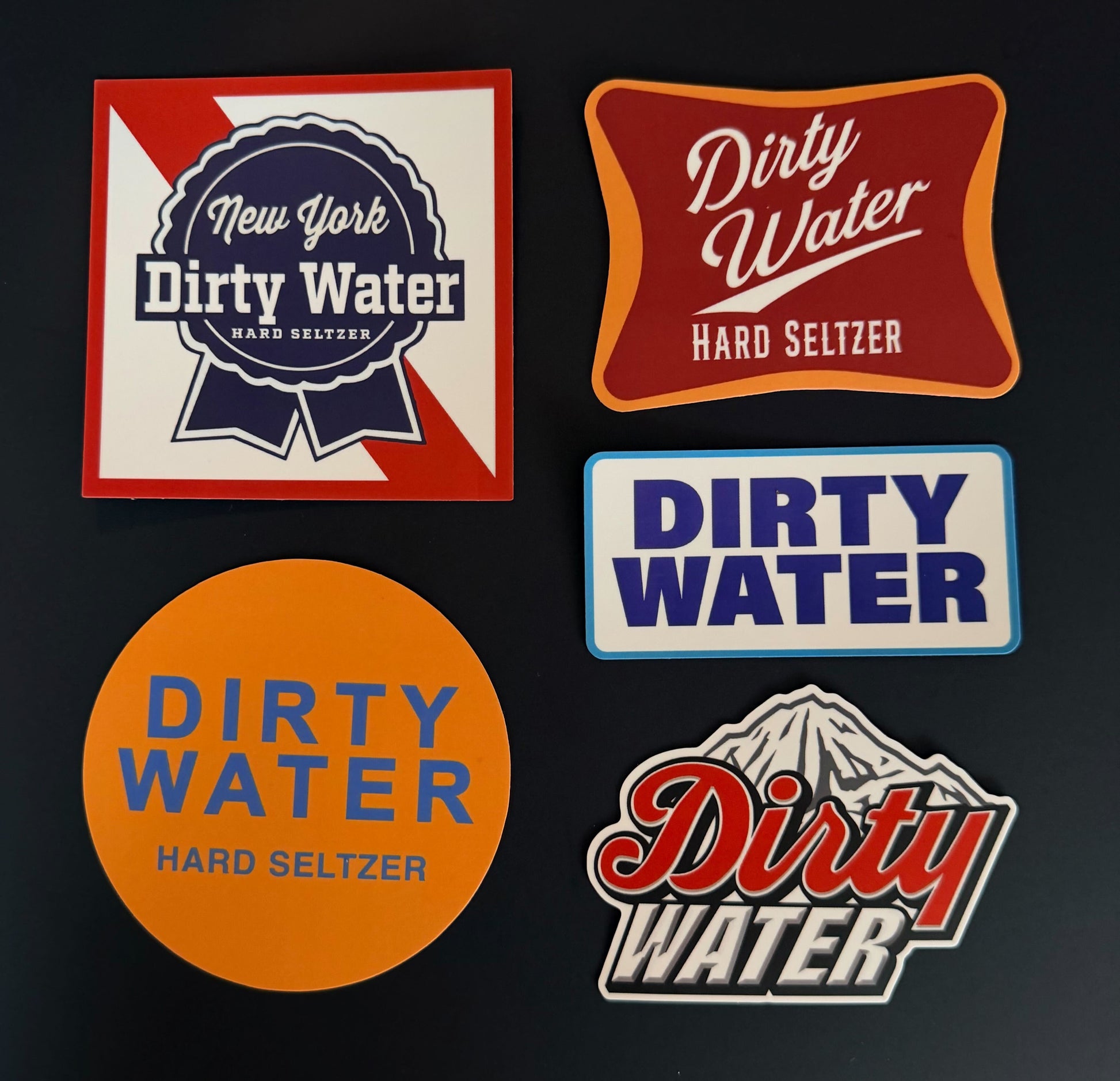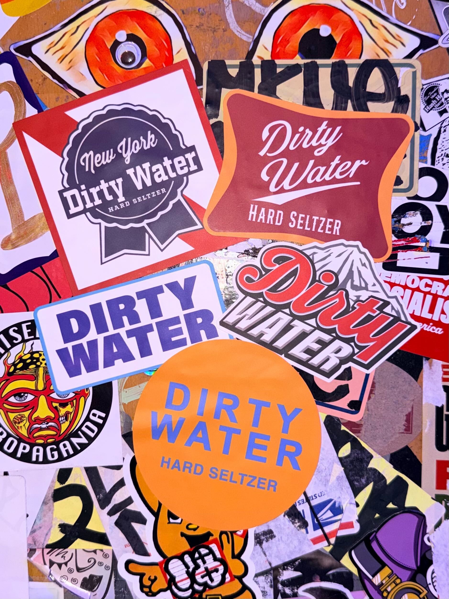 5 DIRTY WATER STICKERS, SHOWN ABOVE. LARGEST STICKER IS 3.5" x 3.5
